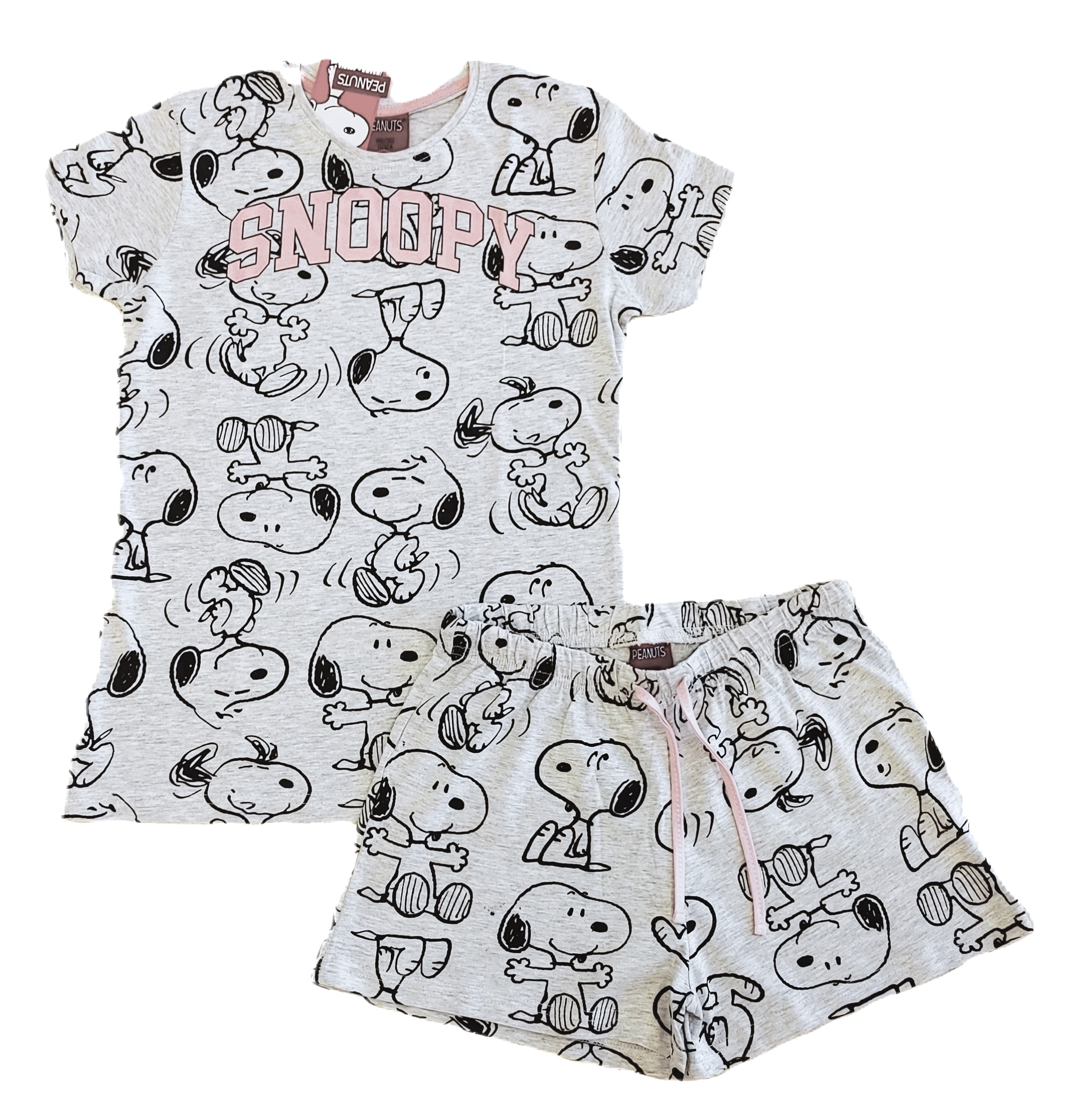 Snoopy Peanuts Mädchen Pyjama/ Shorty-Schlafanzug Hose mit Schlupfbund für bequeme Passform Großflächiger Lizenz-Print kompletter Snoopy Print angenehm weich zu tragen hellgrau mit Snoopy Schrift und Kordeldurchzug in rosa Pflegehinweis: Maschinenwäsche 40° Material: 100 % Baumwolle